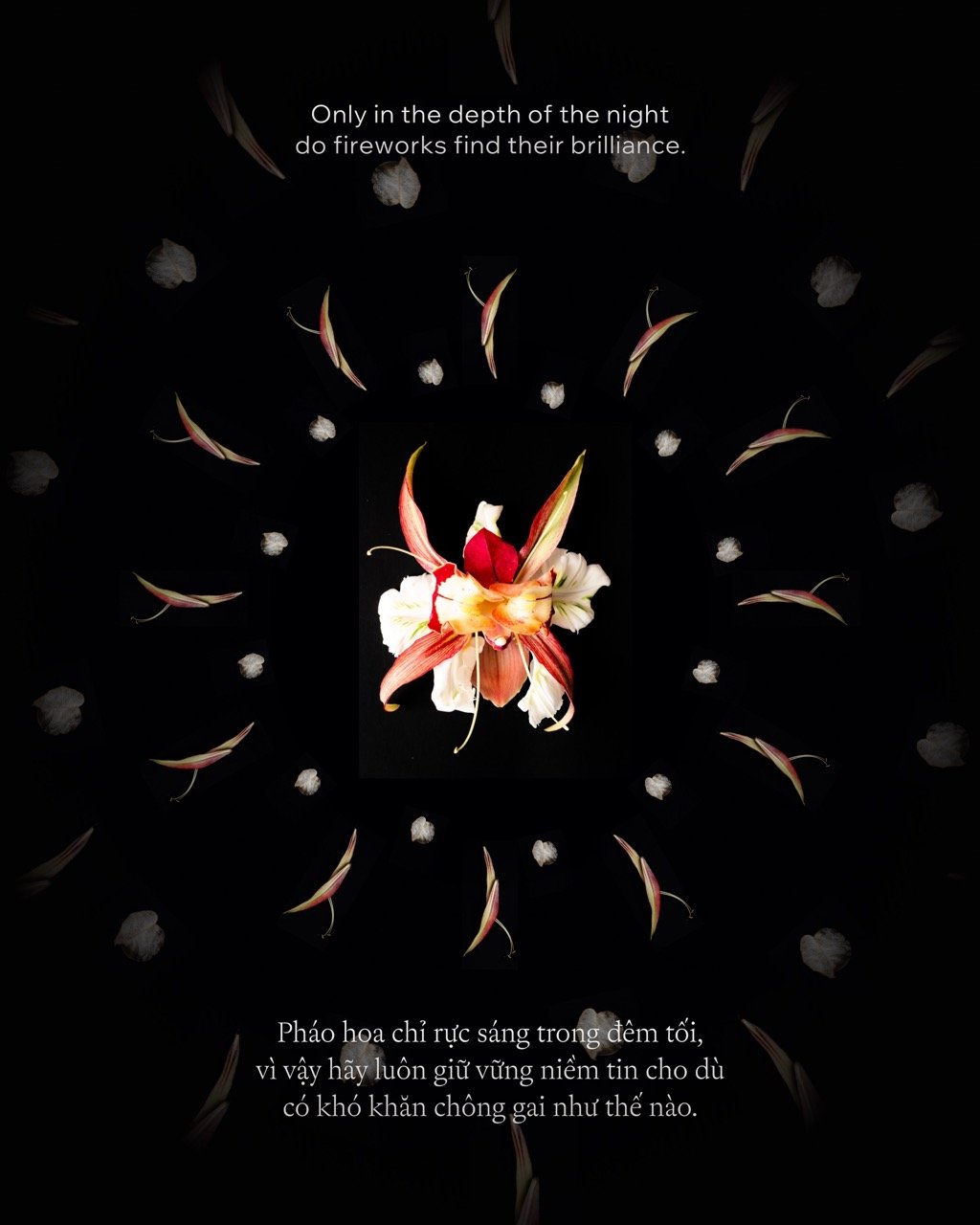 In this project, we reflect on the meaning of light and the beauty of withering. Often, we look for brilliance in the bloom, but there is a distinct, sculptural aesthetic found only in decay. This installation by Keith La Fleur (founded by Vietnamese florist Kiet Tran) challenges us to find hope not in the morning sun, but in the depth of the night. It is a manifesto declaring that even as things fade, they hold a story worthy of reverence.