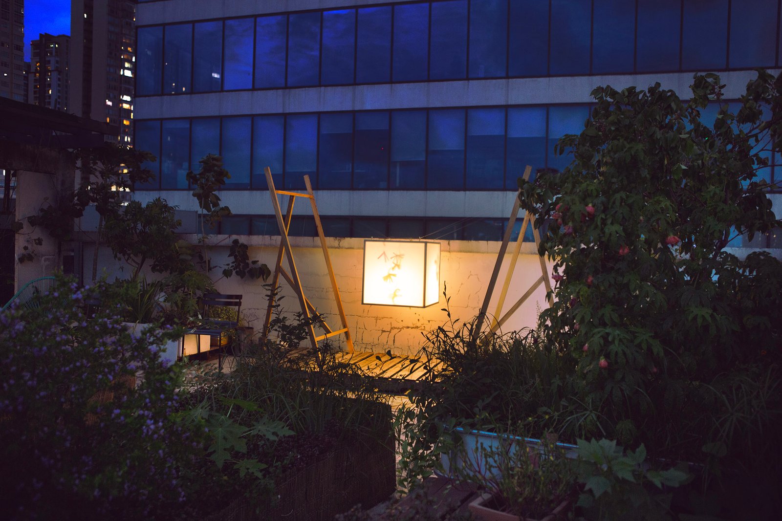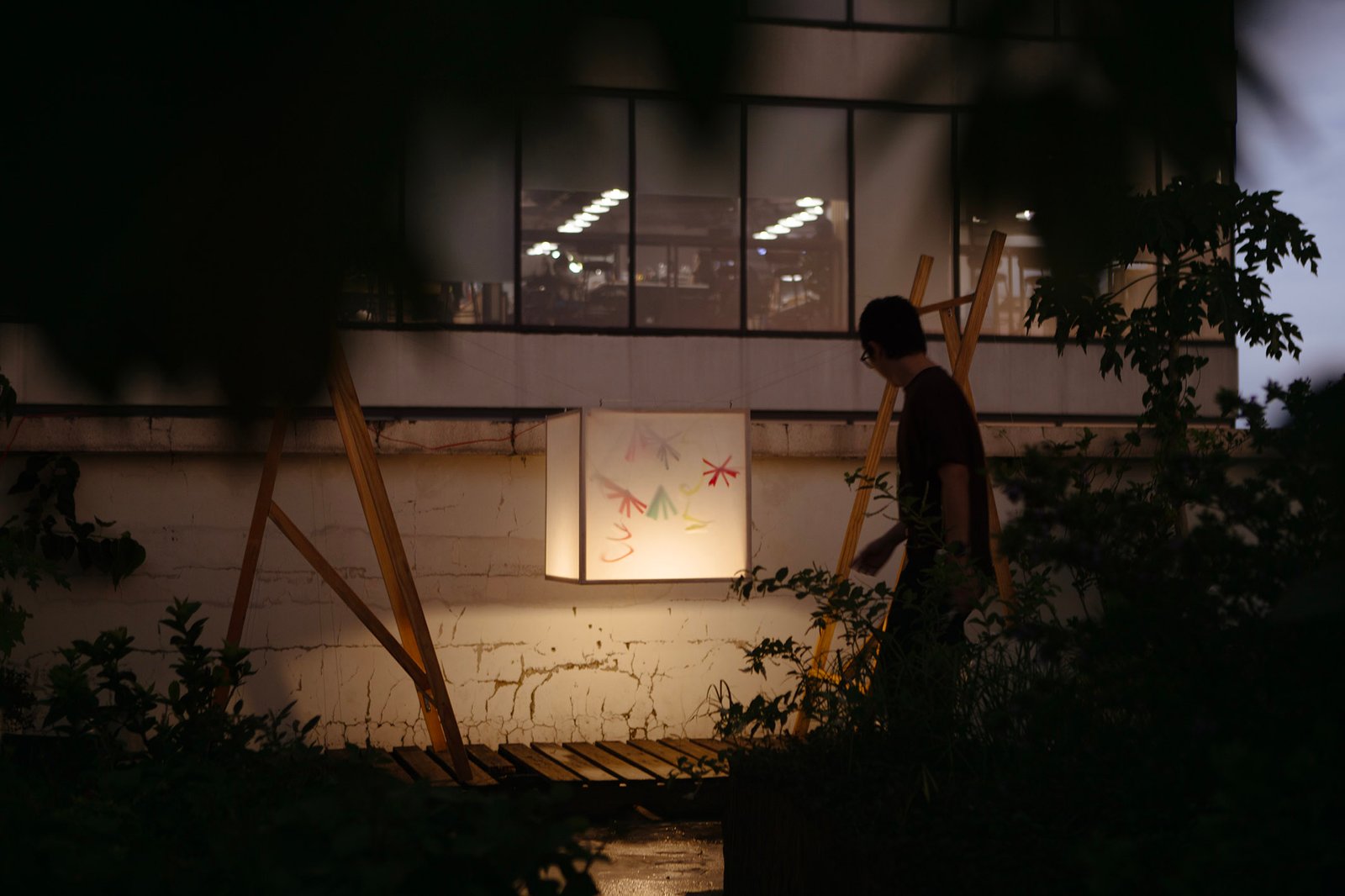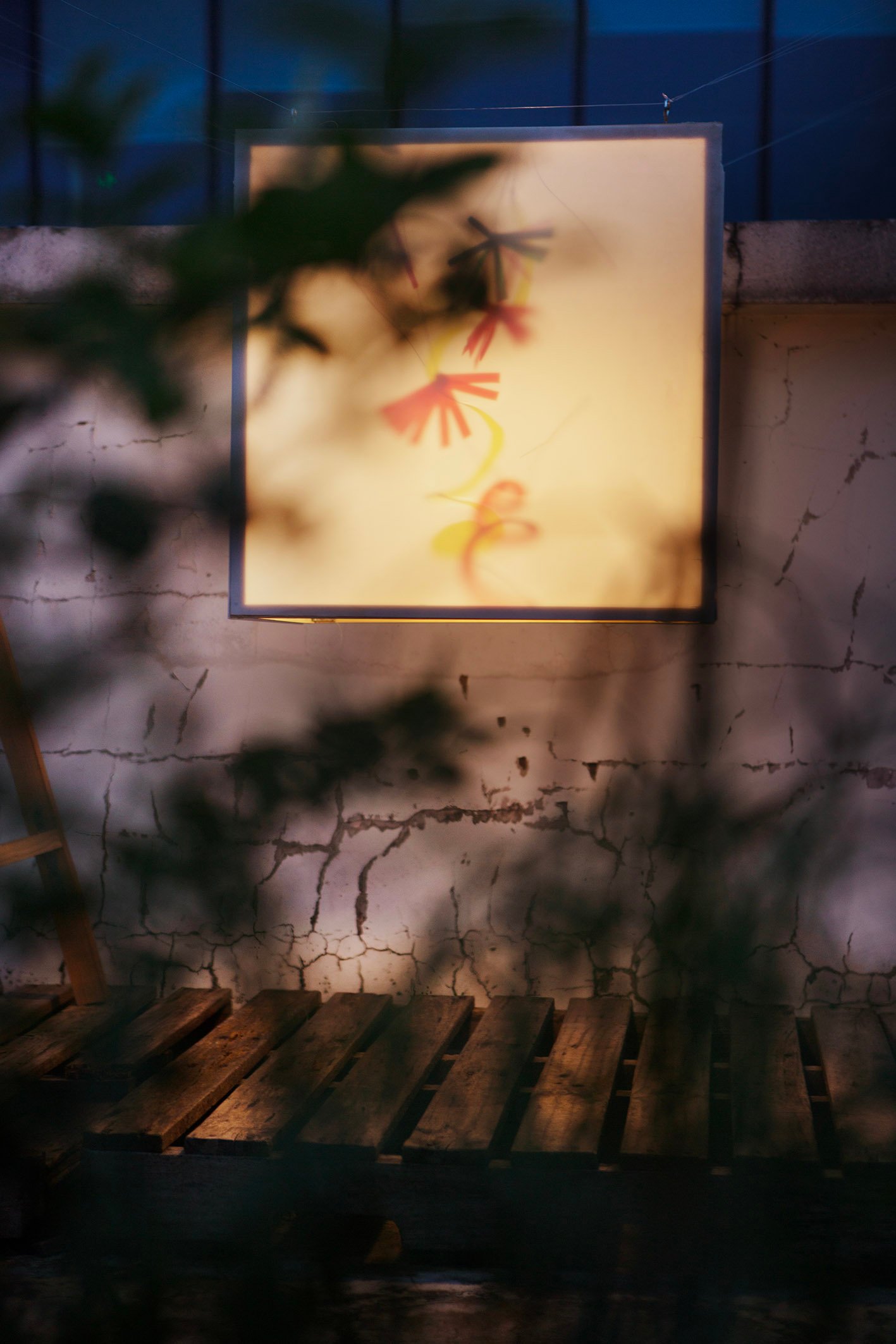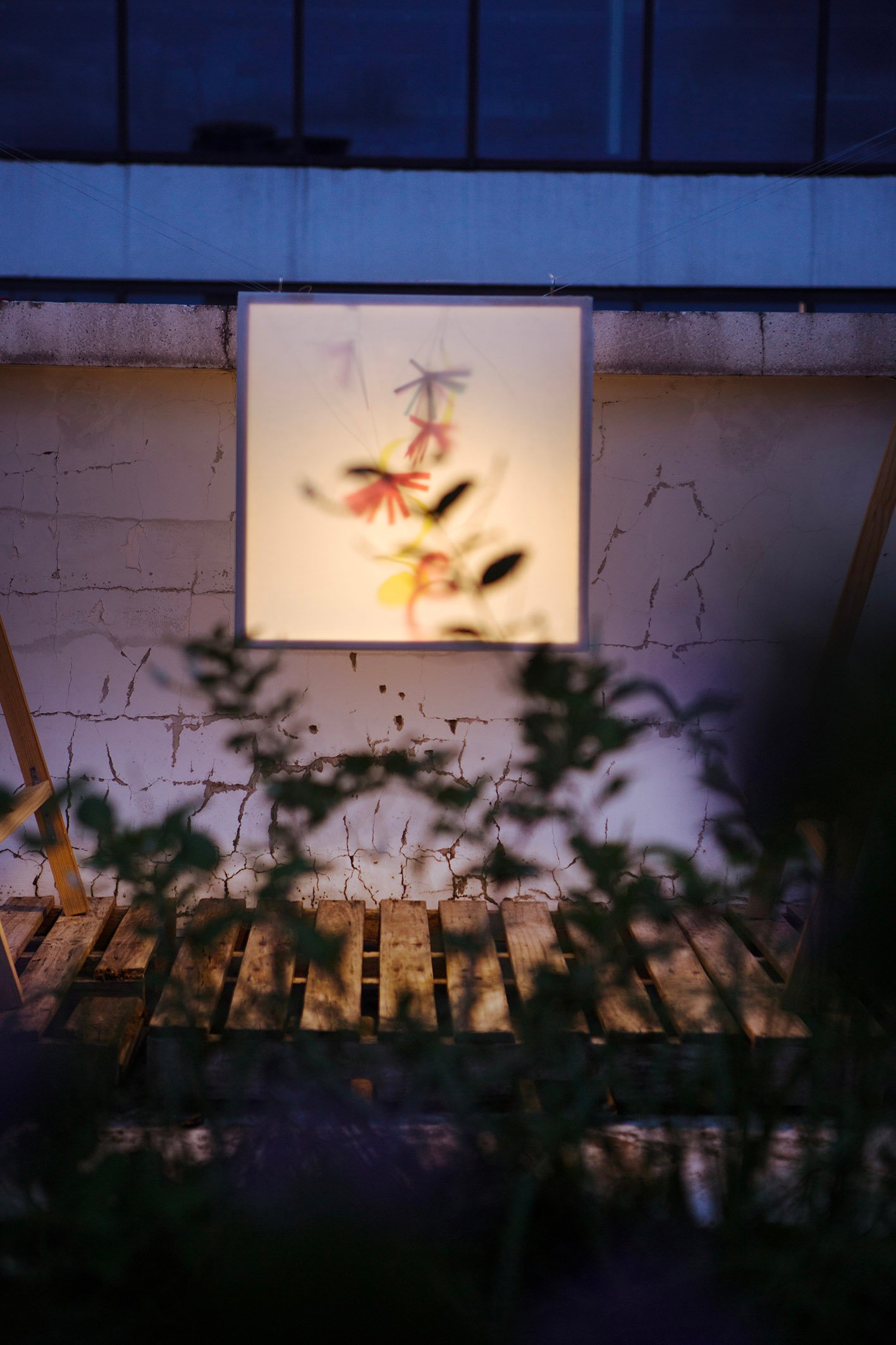 “Floating” in a small garden, “Floating” is a light gently stretched between two wooden frames. Without a declaration or an imposed message, the artwork simply exists as a state of being: floating, still, fragile. During the day, it is present as a familiar part of the garden, clear but not inviting attention. But as evening falls, the light gradually takes shape, becoming a gentle highlight in the garden.