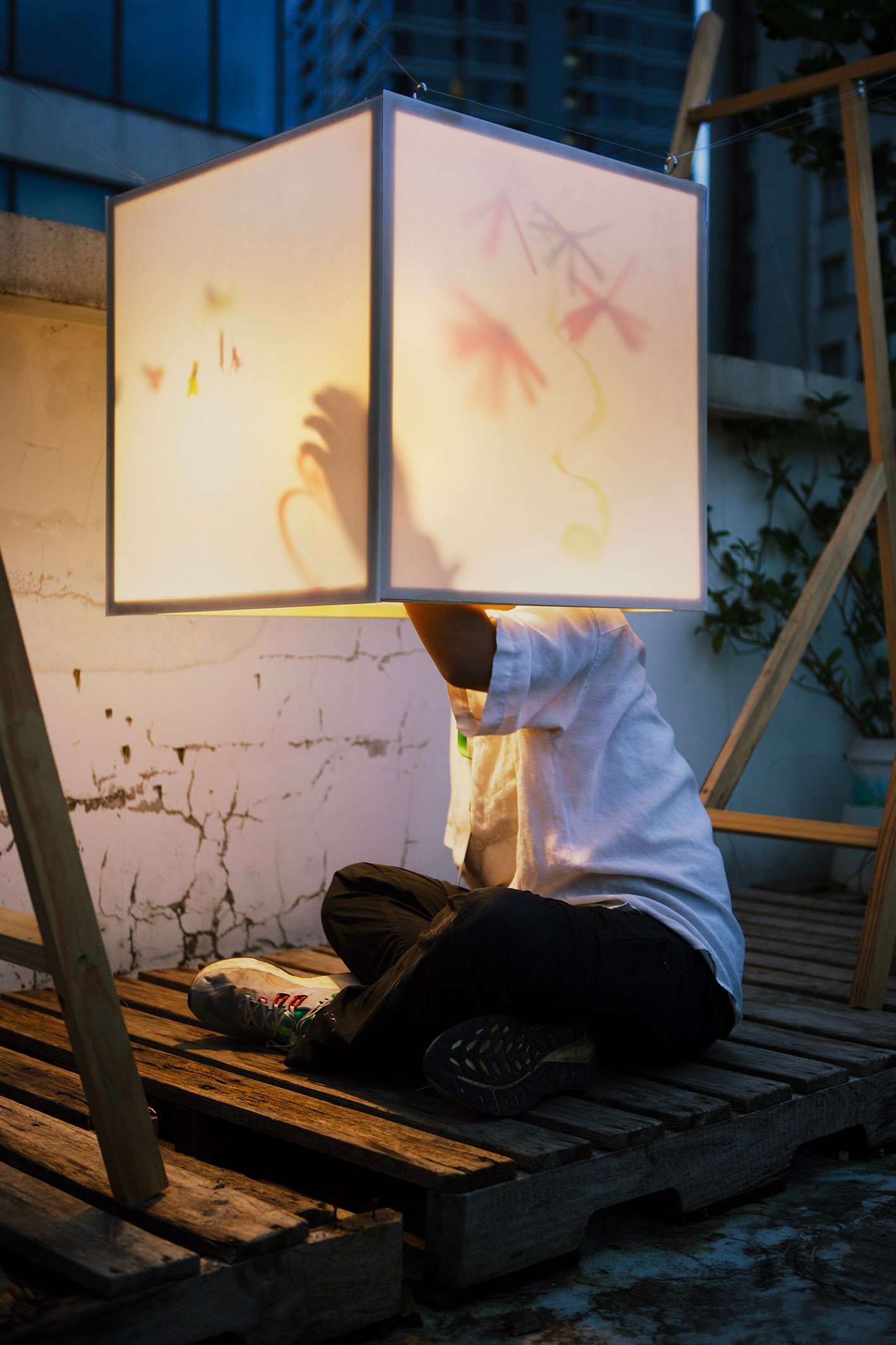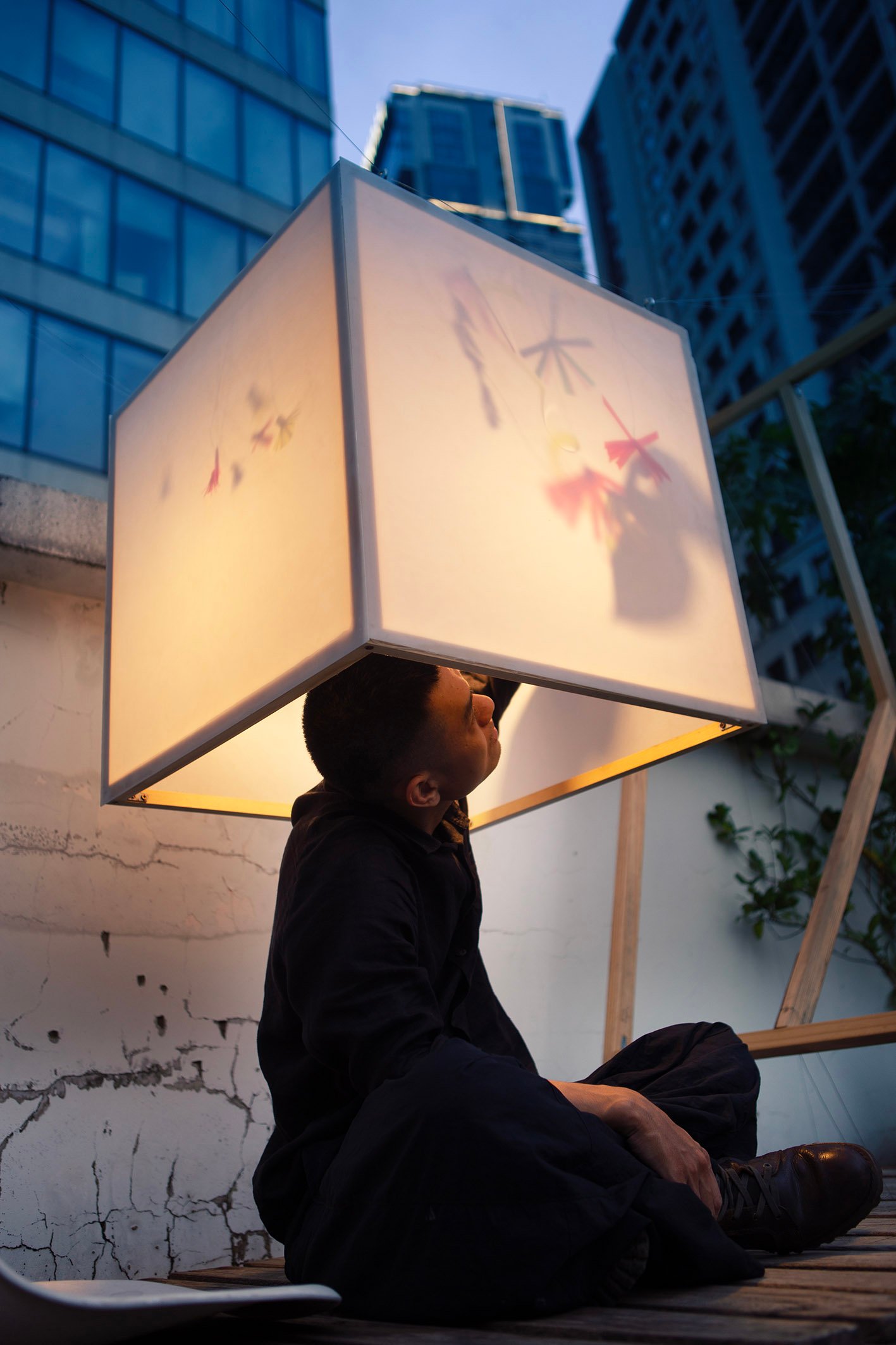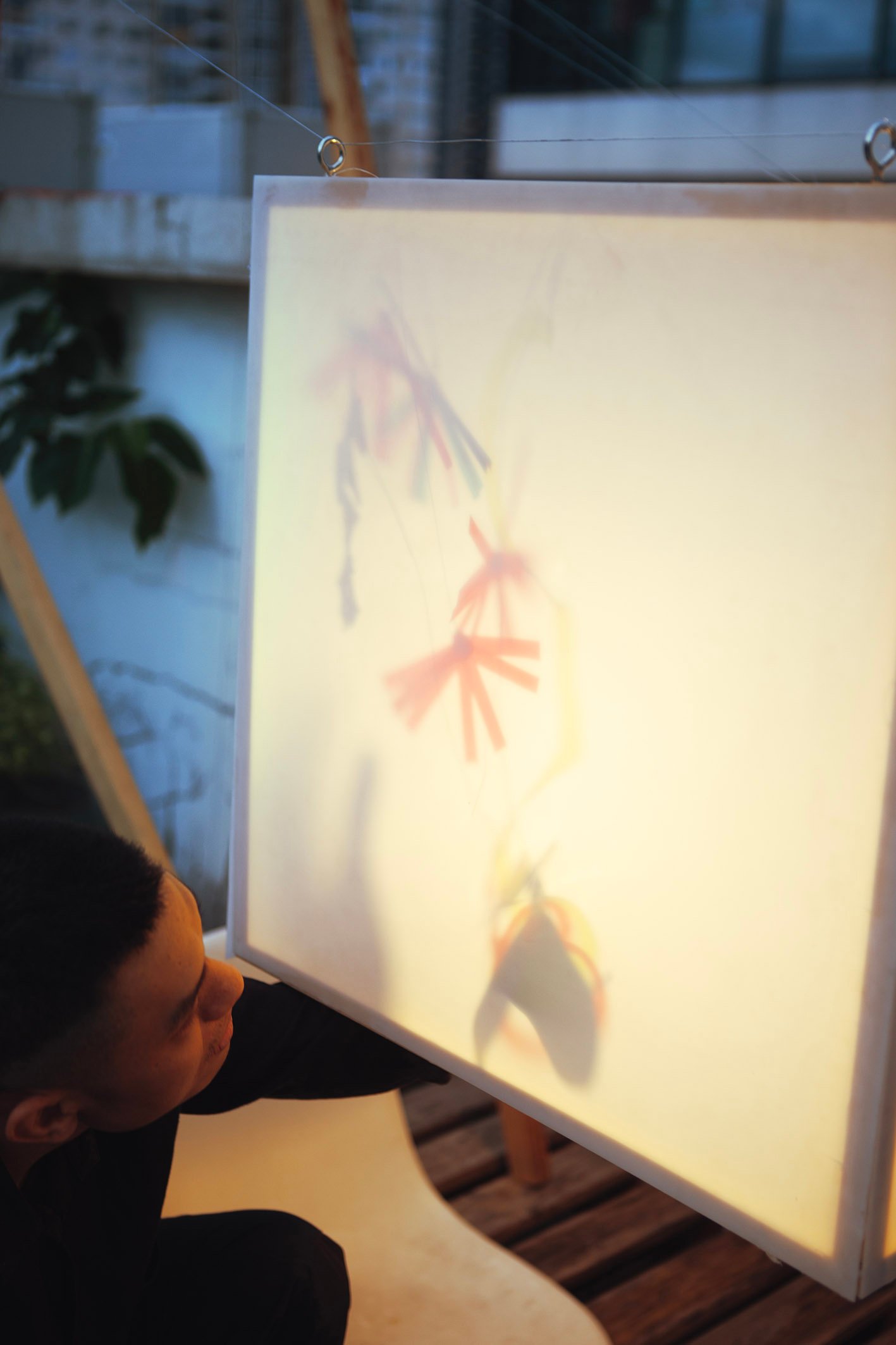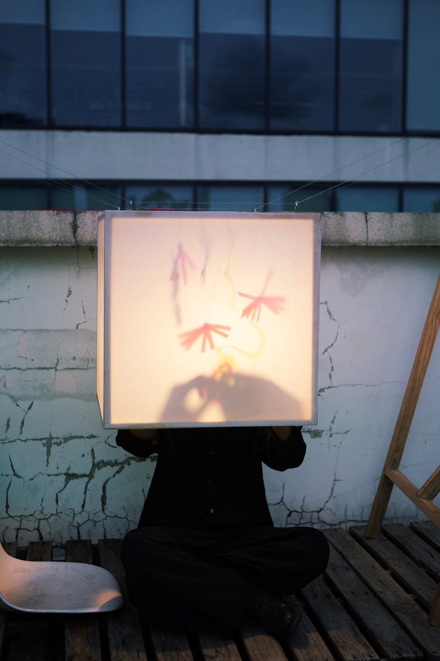 “Floating” in a small garden, “Floating” is a light gently stretched between two wooden frames. Without a declaration or an imposed message, the artwork simply exists as a state of being: floating, still, fragile. During the day, it is present as a familiar part of the garden, clear but not inviting attention. But as evening falls, the light gradually takes shape, becoming a gentle highlight in the garden.