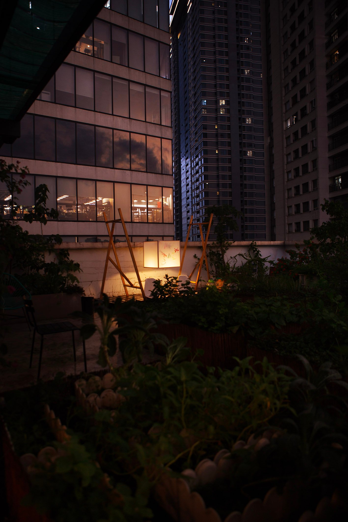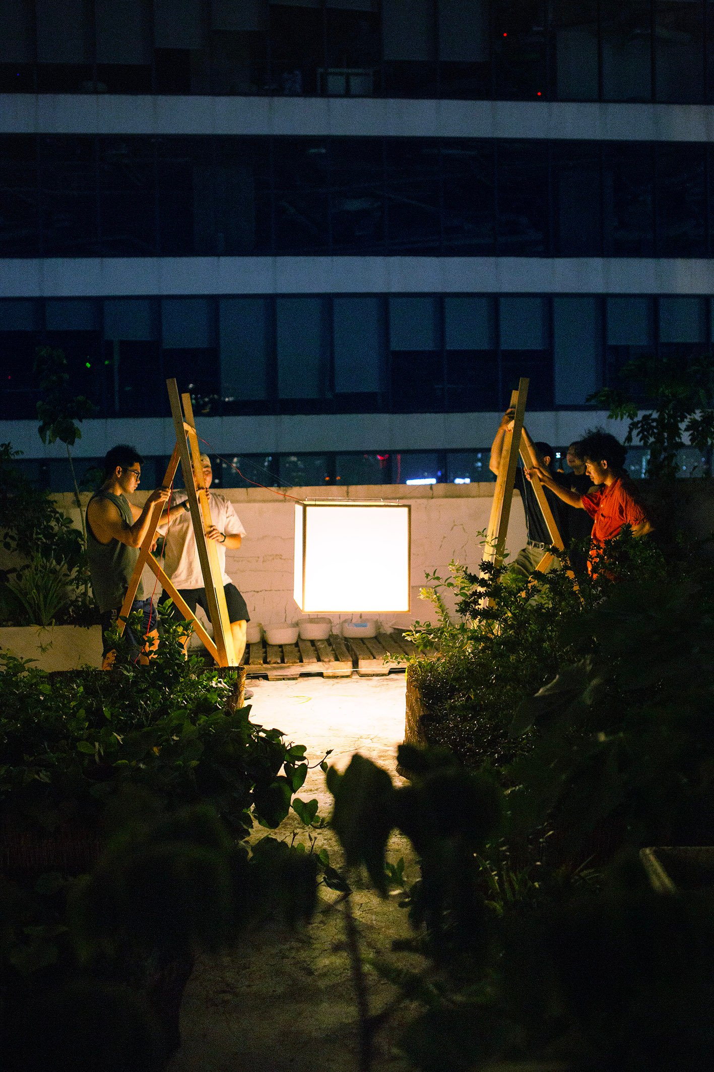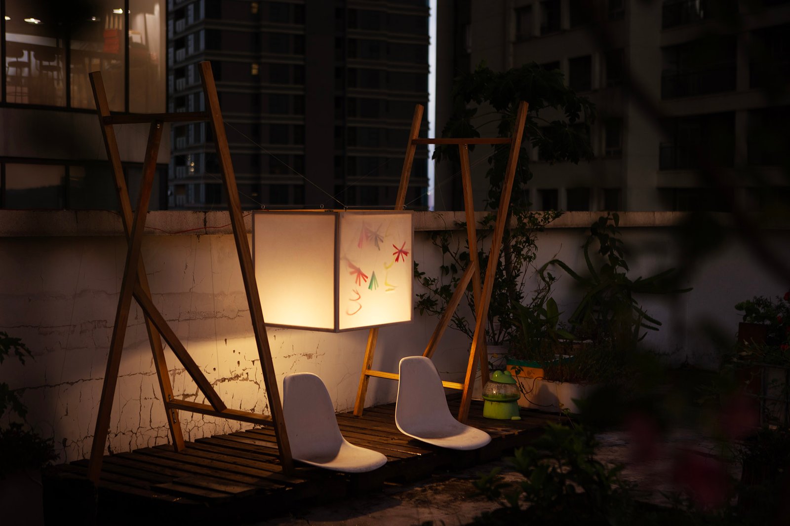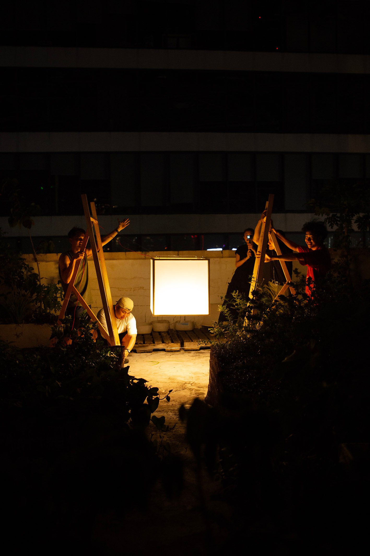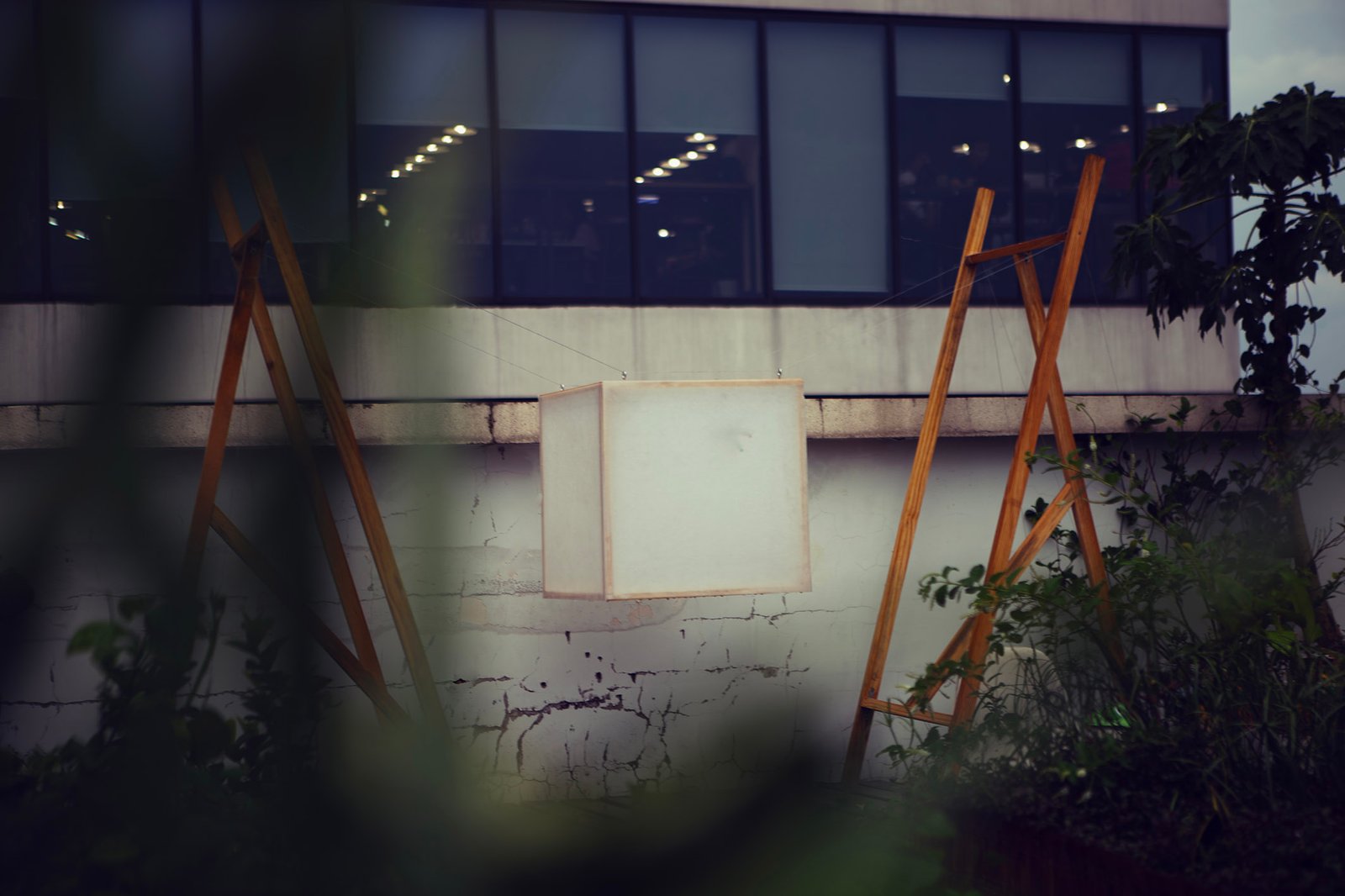 “Floating” in a small garden, “Floating” is a light gently stretched between two wooden frames. Without a declaration or an imposed message, the artwork simply exists as a state of being: floating, still, fragile. During the day, it is present as a familiar part of the garden, clear but not inviting attention. But as evening falls, the light gradually takes shape, becoming a gentle highlight in the garden.