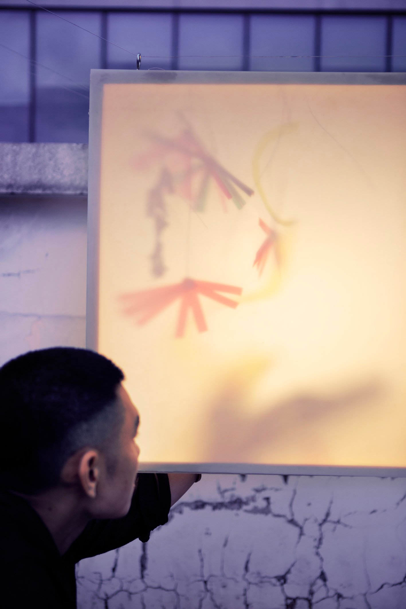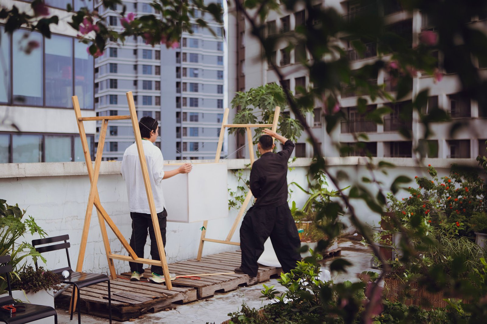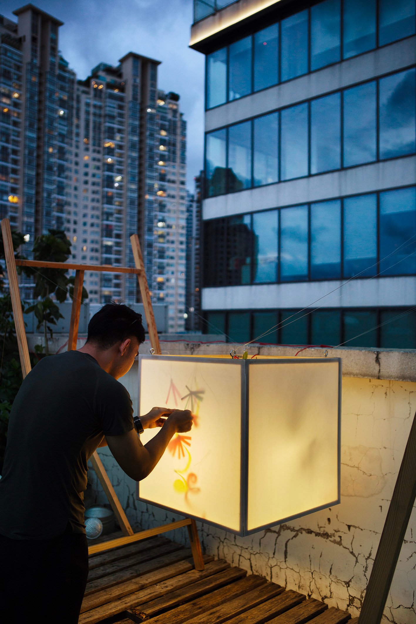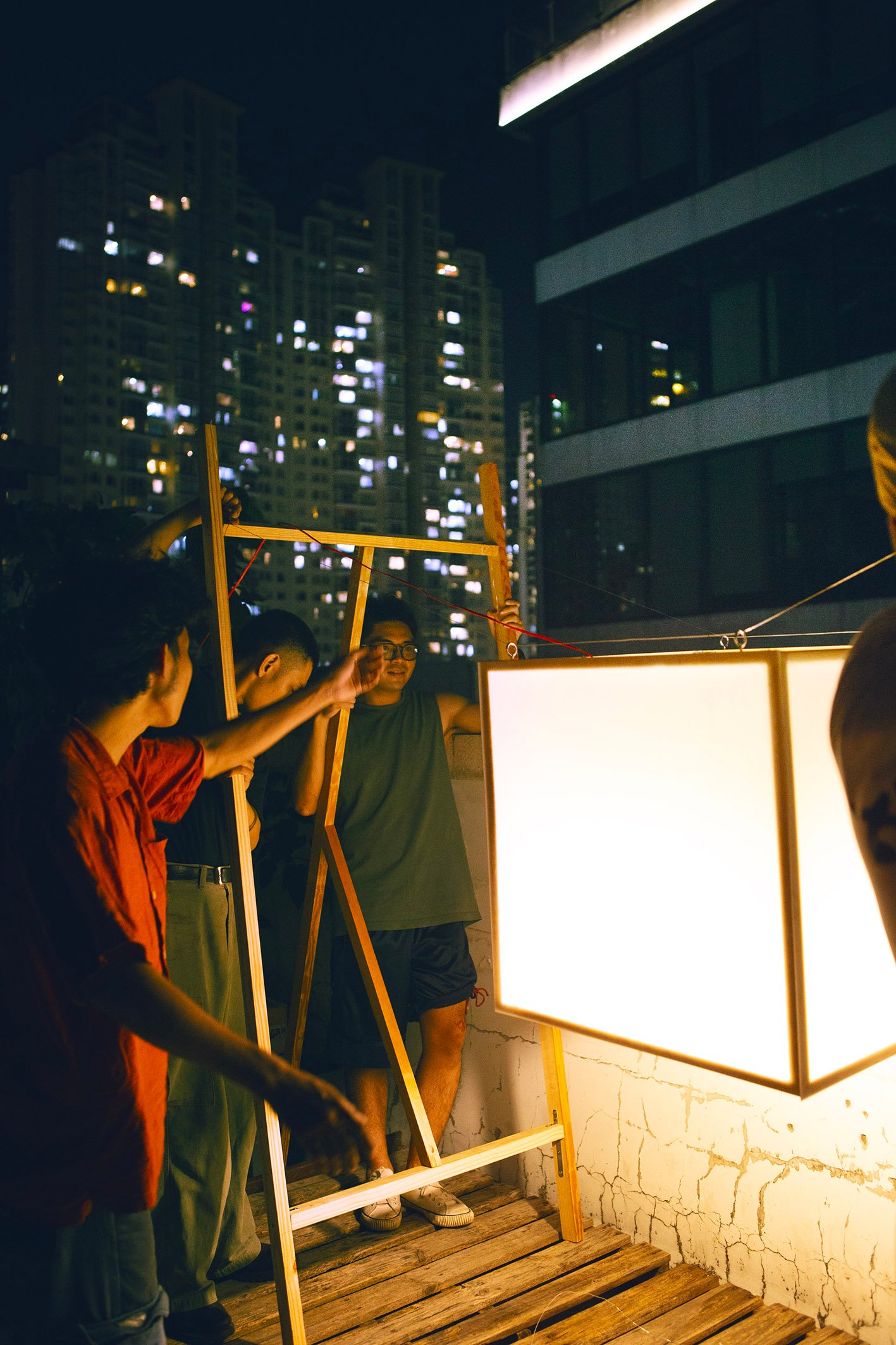 “Floating” in a small garden, “Floating” is a light gently stretched between two wooden frames. Without a declaration or an imposed message, the artwork simply exists as a state of being: floating, still, fragile. During the day, it is present as a familiar part of the garden, clear but not inviting attention. But as evening falls, the light gradually takes shape, becoming a gentle highlight in the garden.